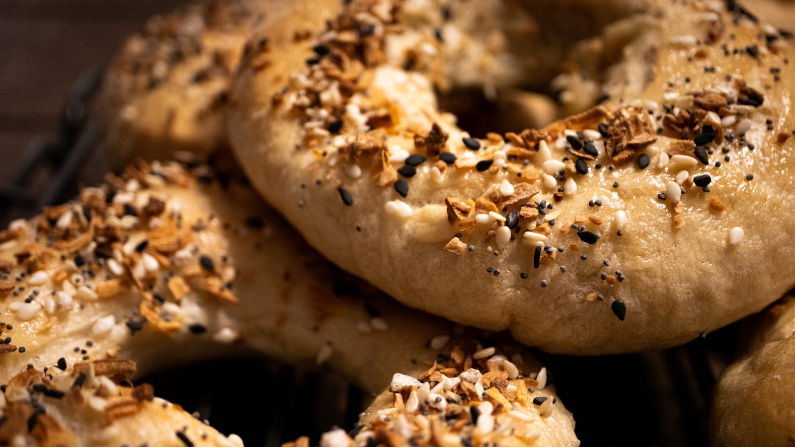 The flight for the last leg of my trip home was boarding. Next to my gate was a bagel shop. Right there on the top row was the only flavour I ever get, everything.